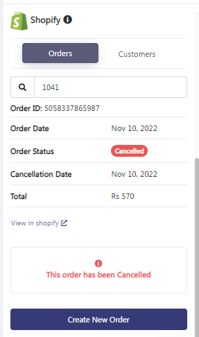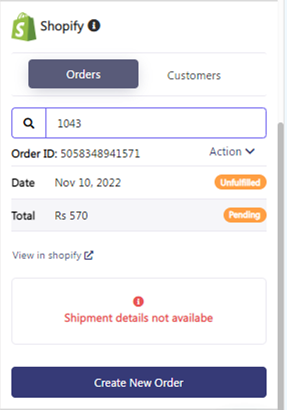 - Click on the Shopify tab in the right-hand panel and enter the order # in the search bar to retrieve the order related information.