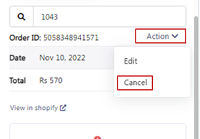 Once cancelled, order will be cancelled from the Shopify store and order status will be updated.
