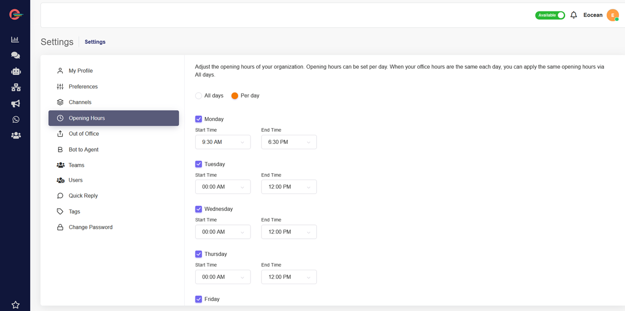Opening hours define the hours when your support team is available to serve customers. By defining your opening hours, you can setup automated messages to be sent to customers when customers interact through a channel outside your business hours